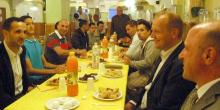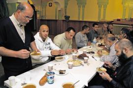 Bis das Modell zu einem realen Gebäude wird, wird indessen noch unbestimmte Zeit vergehen, informierte Beisitzer Fouad Atmani am Sonntag beim Tag der offenen Moschee. Die Marokkaner planen in der Frankfurter Straße 52 bis 56 eine durchaus imposante Moschee. Vor vier Jahren haben sie das Gebäude von einer Spedition erworben. Noch fehlt es aber an der nötigen Finanzkraft, um den Umbau zu stemmen, der immerhin eine Millionen Euro verschlingen wird. Der Freundschaftskreis hofft, das Geld über Spenden und Fördermittel zusammenzutragen. Der Umbau soll zudem mit Krediten finanziert werden. Am hinteren Teil des Gebäudes ist es notwendig, die vorhandene Blechhülle zu entfernen. Außerdem soll eine Zwischendecke für eine Empore in das Gebäude gezogen werden. Eine Baugenehmigung für die Umbauarbeiten liegt bereits vor, betonte Fouad Atmani. Der Freundschaftskreis würde lieber heute als morgen aus der Moschee in der Kelsterbacher Straße 2 bis 4 ausziehen. Fouad Atmani begründet dies mit der schlechten Parkplatzsituation und den beengten Räumlichkeiten, die besonders bei Festlichkeiten und den großen Feiertagen negativ auffallen. Der zukünftige Gebetsraum in der Frankfurter Straße ist mit 500 Quadratmetern fast doppelt so groß wie der Raum, in dem sich die Muslime seit 1996 treffen. Außerdem stehen auf dem 4000 Quadratmeter großen Grundstück ungleich mehr Parkmöglichkeiten zur Verfügung. In dem ehemaligen Speditionsgebäude wird den Kindern übrigens bereits Nachhilfeunterricht erteilt. In der neuen Moschee werden zudem ein Café, eine kleine Bücherei, Schulungsräume und ein Versammlungsraum eingerichtet. »Hier finden dann alle Vereinsaktivitäten wie Kultur- und Bildungsarbeit statt«, erklärte Fouad Atmani. Eine Moschee dient übrigens den Muslimen nicht der Identitätsstiftung, verleiht ihnen auch nur in Ansätzen das Gefühl von Heimat. Vielmehr spielt sich in der Moschee schlicht das religiöse aber auch das kulturelle Leben ab. Muslime erhalten von Gott eine größere Belohnung, wenn sie in der Gemeinschaft und nicht alleine beten. »Ein Muslim lebt in der Gemeinschaft«, erklärt Fouad Atmani. Die Moschee ist auch Heim für den Freundschaftskreis. Der Verein ist ein wichtiges Scharnier zwischen der marokkanischen Bevölkerung und Einrichtungen wie Stadtverwaltung und Schule. Der Freundschaftskreis ist der offizielle Ansprechpartner, erläutert Fouad Atmani. Er informiert die Mitglieder aber auch über die islamischen Feste und Veranstaltungen. Der Freundschaftskreis öffnet seit einigen Jahren am Tag der deutschen Einheit zum bundesweiten Tag der offenen Moschee die Türen des Gebetshauses. Auch wenn der Zuspruch eher durchwachsen ist, wollen sich die Marokkaner jedes Jahr an diesem Tag der Bevölkerung vorstellen. Zu den Gebetszeiten morgens, mittags, nachmittags, abends und nachts steht die Moschee ebenfalls offen. Das ist ebenfalls ein Stück Integrationsarbeit, die der Freundschaftskreis bereits mit den Dialogabenden mit der evangelischen Philipp-Melanchthon-Gemeinde leistet. Am Mittwoch (6.) lautet beim nächsten Dialogabend ab 19.30 Uhr im evangelischen Gemeindezentrum in der Niddastraße 15 bis 17 das Thema »Umgang mit Menschen«. 11. September 2010 | Von Rüdiger Koslowski - Rüsselsheimer Echo Eine Chance, Gutes zu tunReligion: Was bedeutet der Fastenmonat Ramadan für Muslime? - Thilo Sarrazin und Terry Jones sorgen für Gesprächsstoff Nun ist Ramadan vorbei: Mitglieder des marokkanischen Freundschaftskreises beim Fastenbrechen. Foto: Rüdiger Koslowski Bedächtig bereiten die Muslime das Fastenbrechen vor. Der Tisch wird gedeckt. Vor dem Abendgebet dürfen sie bereits Datteln und Milch zu sich nehmen. Danach wird eine warme Gemüsesuppe mit Lammfleisch, Nudeln, Koriander und Petersilie, Reis mit Hühnchen, Kuchen und eine Pizza gereicht.